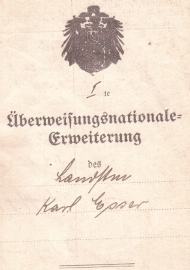 Ergänzung zur Überweisungsnationaleim Militärpass des Soldaten Karl Esser, Niederaussem(als eingeklebter Einleger) |