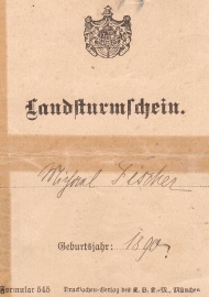 Landsturmschein für einen Michael Fischer der Ober-Ersatz Commision im Bezirk Regensburg, welcher zur XII Bay. Inf. Brigade gehört. |