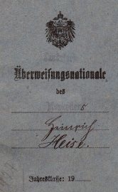 (Landsturm-) Überweisungsnationale für den Musketier Heinrich Heise;eingezogen zum 2. Rekrutendepot des Infanterie Regiments 64General-Feldmarschall Prinz Friedrich Karl von Preußen (8. Brandenburgisches);und anschließend versetzt zur Infanterie Ersatztruppe WarschauAm Ende ist der Landsturmschein eingeheftet. |