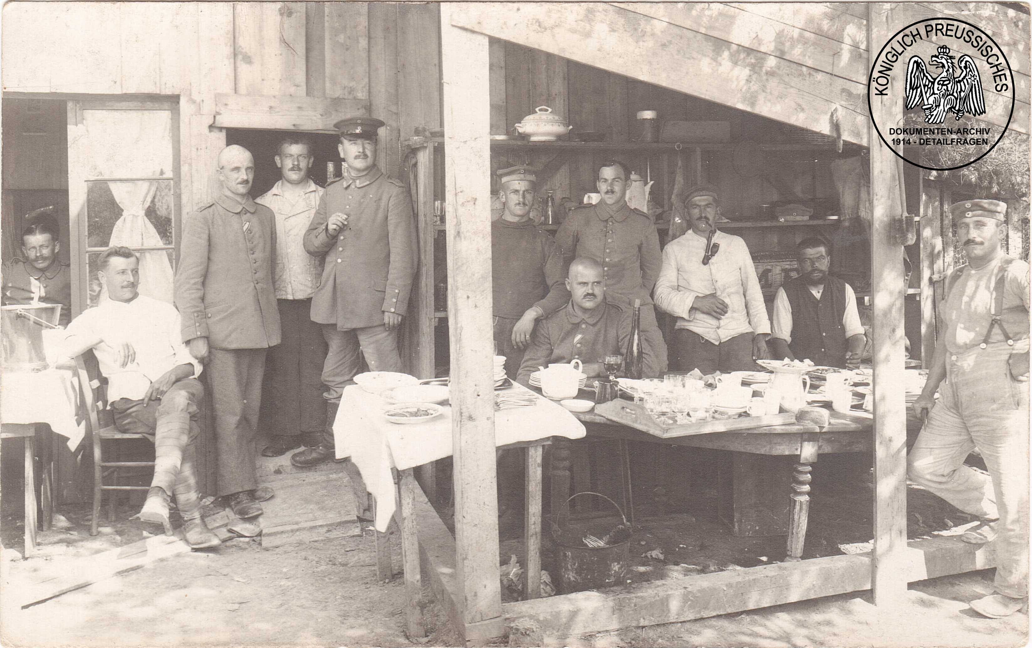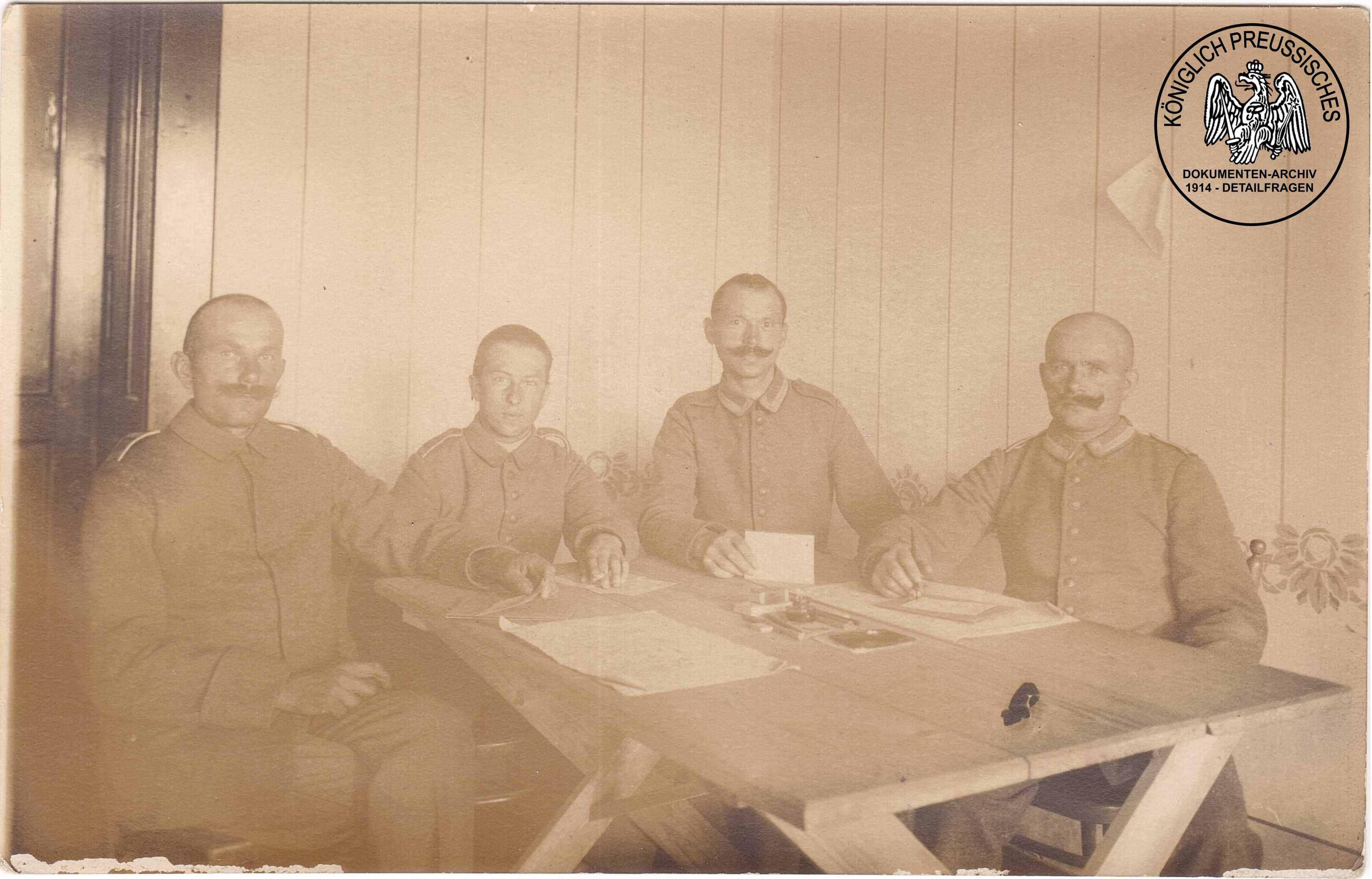Das Bild scheint in einer Garnison/Kaserne entstanden zu sein, wenn man die Betten im Fenster im Hintergrund sieht. Bei der Gruppe scheint es sich um eine Stube Rekruten zu handeln, die kurz vor dem Ausmarsch stehen; der Blick in die Gesichter sagt mir daß die Männer recht jung sind; die Schulterstücke sind an der Uniform und aufgerollt. |