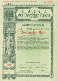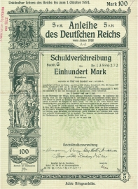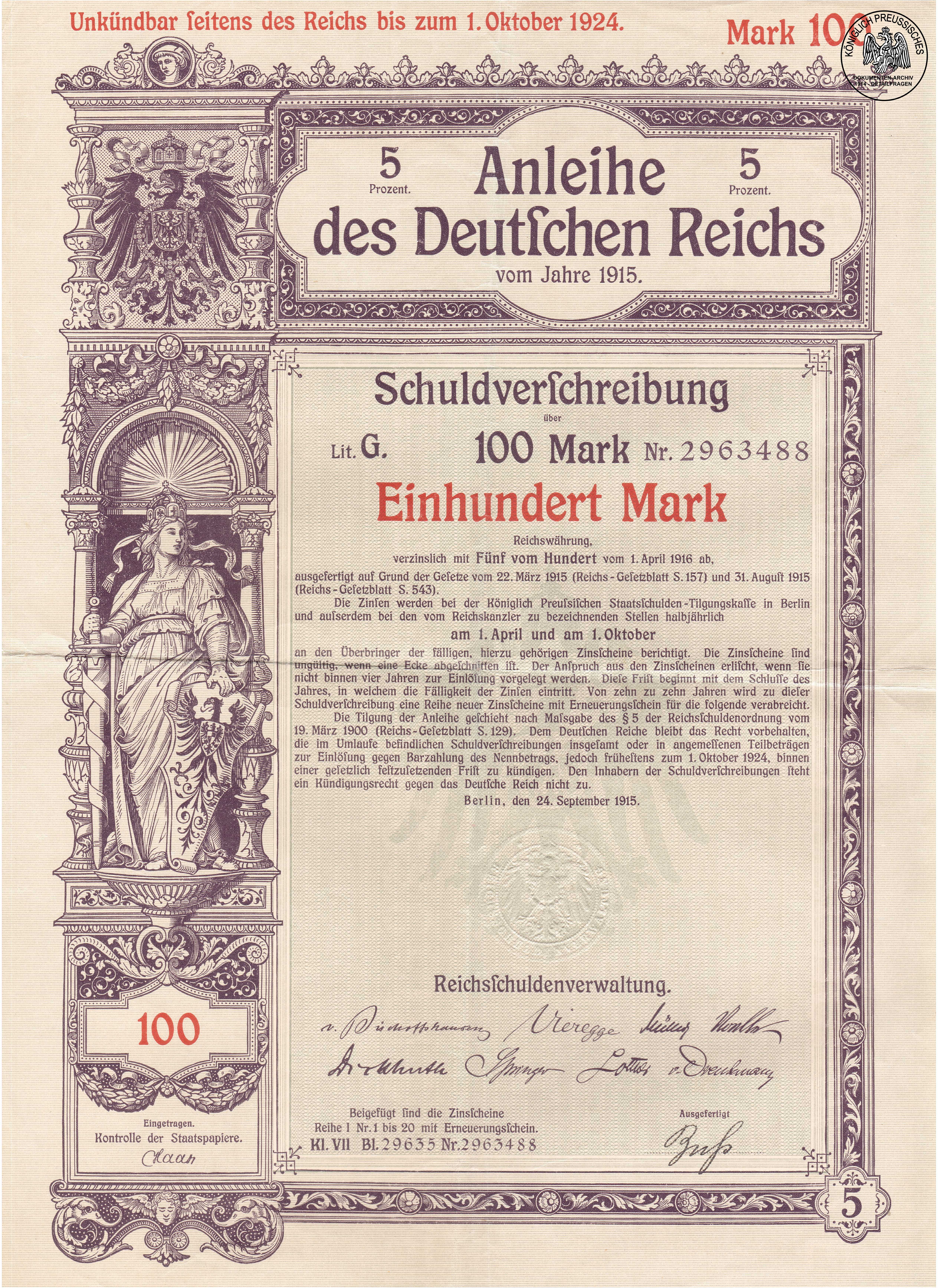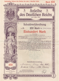 Anleihe des Deutschen Reiches vom 31. August 1915 im Wert zu 100M;Verzinsung 5%Herausgegeben von der Reichsschuldenverwaltung. |