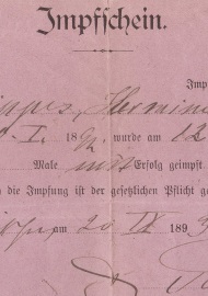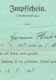 Bescheinigung der Erstimpfung des Impflings Hermine Herbstgem. den gesetzlichen Bestimmungen. Interessant ist der Auszug der gesetzlichen Bestimmungen auf der Rückseite des Impfscheines. |
