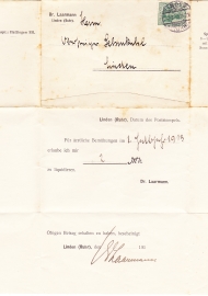 Arztrechnung für den Obersteiger Lehmkuhl die von Dr. Laarmann in Linden (Ruhr) im Halbjahr 1913 erbracht wurden. Mit freundlichen Genehmigung: Anke Bartröver, Dortmund |