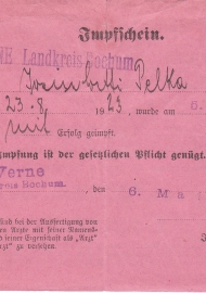 Impfschein für Irene Betti Pelka aus Werne. Der Impfschein bestätigt die gesetzlich vor- geschriebene Erstimpfung direkt nach der Geburt. Mit freundlichen Genehmigung: Anke Bartröver, Dortmund |