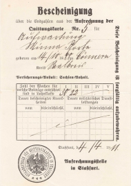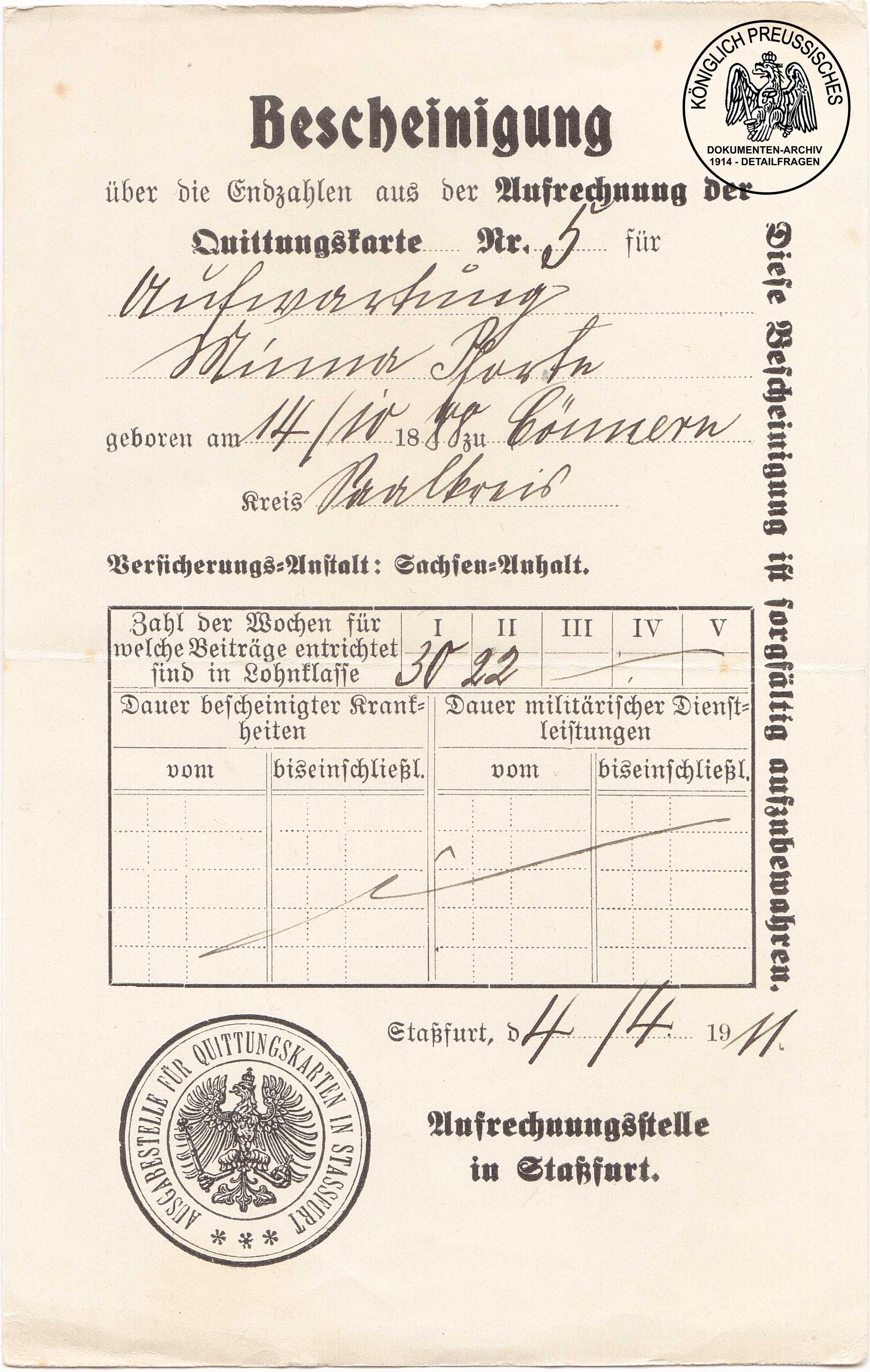 Bescheinigung über die Zahlungen von Sozialabgaben an die Versicherungsanstalt Sachsen-Anhalt für das 1888 geborene Hausmädchen Mimma Pforte. |