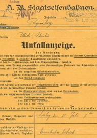 Unfallanzeige der Kgl. Bay. Eisenbahn über den Unfall des Lokführers Alois Glockner aus Passau.