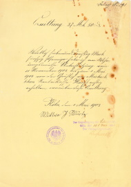 Krankheitsbescheinigung gem. § 1438 RVO für den Schlepper Wilhelm Beer, der in der Zeit vom 14.03.1914 bis zum erkrankt war. Ausgestellt ist die Bescheinigung vom Niederschlesischen Knappschaftsverein. |