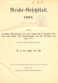 Reichs Gesetzblatt 1902 Gesetze und Verordnungen vom 08.01.1902 - 26.12.1902. 1902/17 | Reichshaushaltsetat | 1902/24 | Schaumweinsteuergesetz | 1902/37 | Bekanntmachung über die wechselseitige Benachrichtigung der Militär- und Polizeibehörden über das Auftreten übertragbarer Krankheiten. | (Hinweis: Der aktuelle Scan enthält die "Zeitliche Übersicht", sowie ausgewählte Gesetze.) |