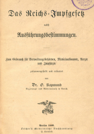 Das Reichsimpfgesetz vom 08.04.1874 nebst Ausführungsbestimmungen. Zum Gebrauch für Verwaltungsbehörden, Medicinalbeamte, Aerzte und Impfärzte. Berlin, 1889 |