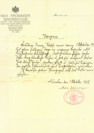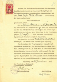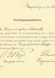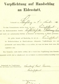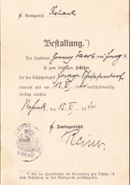 Bestallung für den Landwirt Georg Jacob als beeidigter Schätzer (Sachverständiger) für Grundstücke und Immobilien. Im Anhang der Urkunde befinden sich die recht- lichen Grundlagen und Vorschriften für die Tätig- keit als Schätzer. Das "Formular" selber scheint noch auch der Zeit des Königreichs Bayern zu stammen, denn die Republikanisierung erfolgte durch Streichung des "k" vor dem "Amtsgericht". |