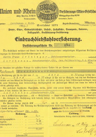 Einbruchdiebstahlversicherungs-Police der Union und Rhein Versicherungs-AG für das Ladenlokal des Schlossermeisters