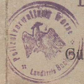 Siegel der Polizeiverwaltung Werneim Landkreis Bochum.(aus einem Personalausweis) Mit freundlichen Genehmigung: Anke Bartröver, Dortmund |