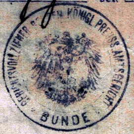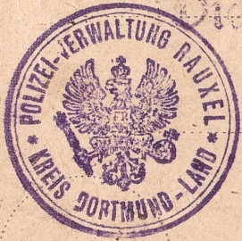 Siegel der Polizeiverwaltung Rauxel im Landkreis Dortmund-Land(aus einem Personalausweis)Interessant hieran, das dieses auch 1921 noch verwendet wurde! |