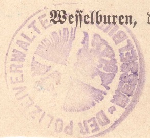 Siegel des Polizeiverwalters Wesselburen. Interessant an diesem Siegel: Durch "einfaches" Durchkreuzen des königlichen Adlers wurde dieser Stempel "republikanisiert". |