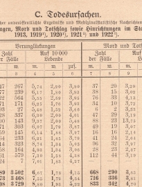 Todesursachenstatistik in Bezug auf Selbstmord (Selbsttötung),sowie Mord und Totschlag (incl. Hinrichtungen)Berichtszeitraum 1913, 1919 - 1922 |