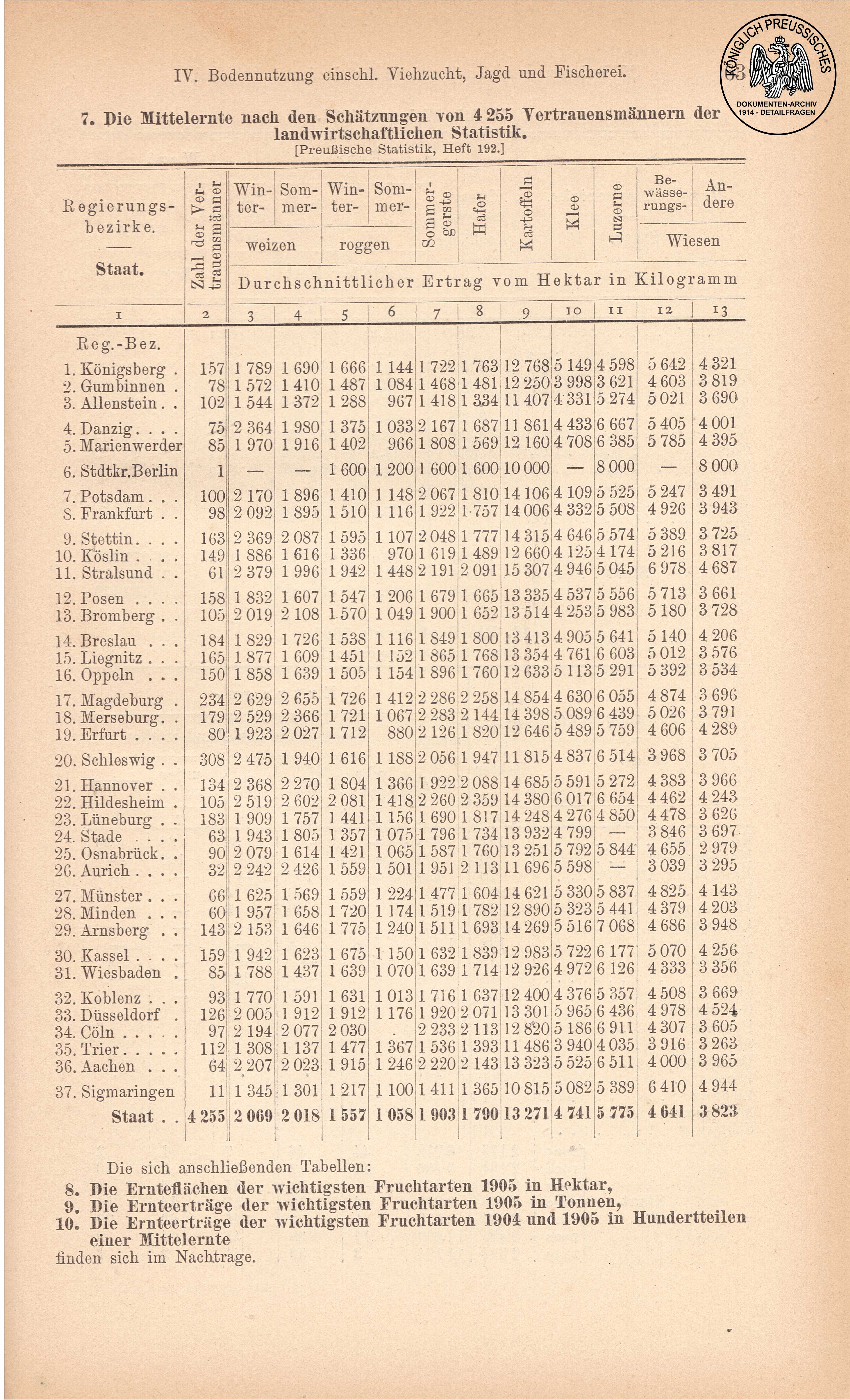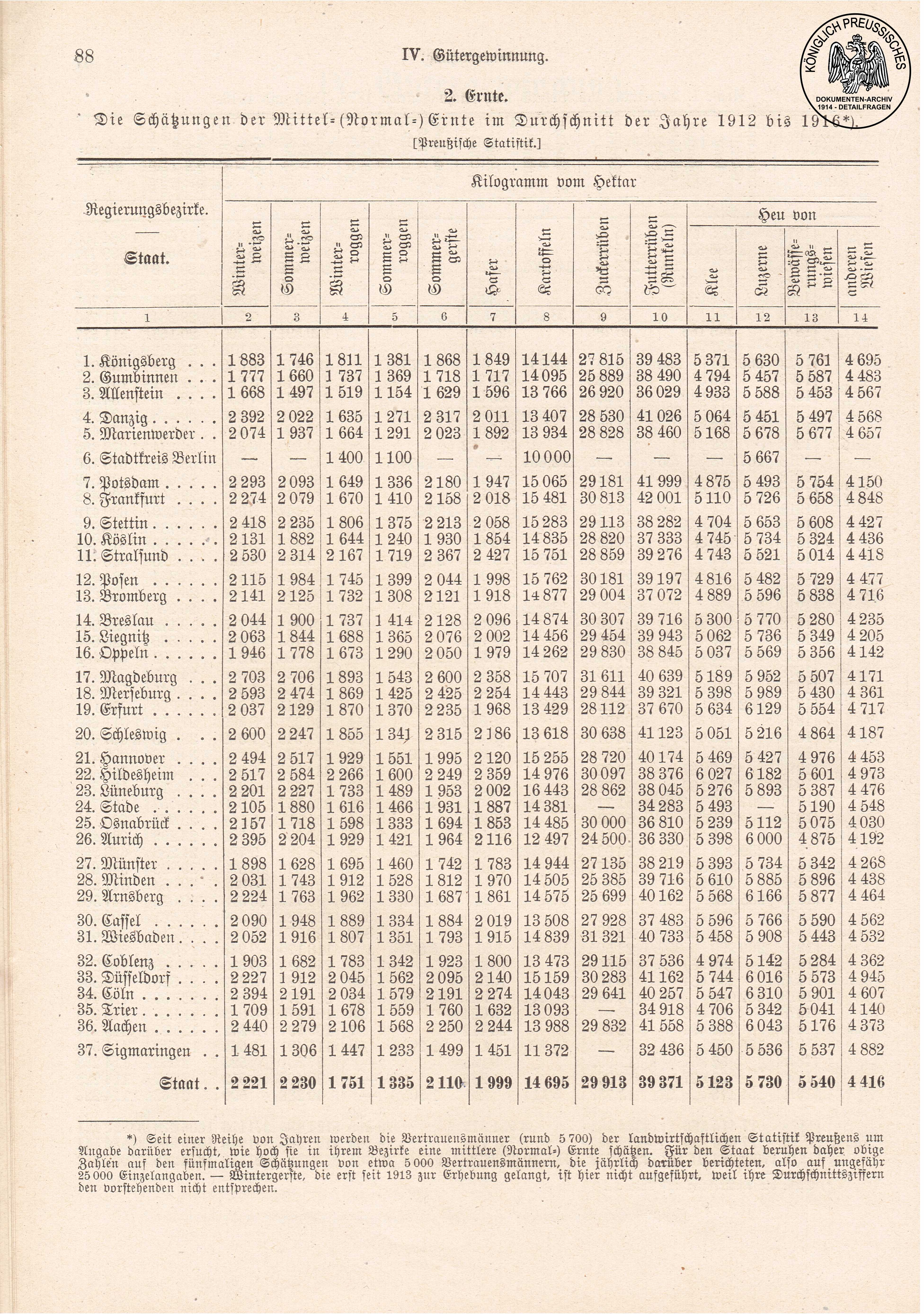 Schätzung der Mittel- (=Normal-) Ernte im Durchschnitt der Jahre 1910 und 1914;die Schätzungen basieren auf den Angaben von 4255 Vertrauensmännern.Erhebungszeitraum 1910 - 1914Detailzahlen zum Ernteertrag. |