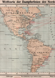 Weltkarte mit den Dampferlinien, die vom Norddeutschen Lloyd befahren wurden. Herausgegeben von Hobbing & Co., Berlin. |