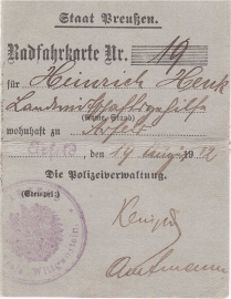 Radfahrkarte für den Landwirtschaftgehilfen Heinrich Henk. |