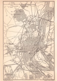 Stadtplan von Magdeburg, wahrscheinlich aus einem Baedeker Reiseführer. Die Karte selber stammt von Wagner & Debes aus Leipzig. In diesem Zusammenhang ist diese Diplomarbeit zum Thema: Struktur, Funktion und Entwicklung der Karten in den Baedeker-Reiseführern der Jahre 1827 - 1945 von Vincenz Elias Weirauch, Universität Dresden sehr lesenwert. |