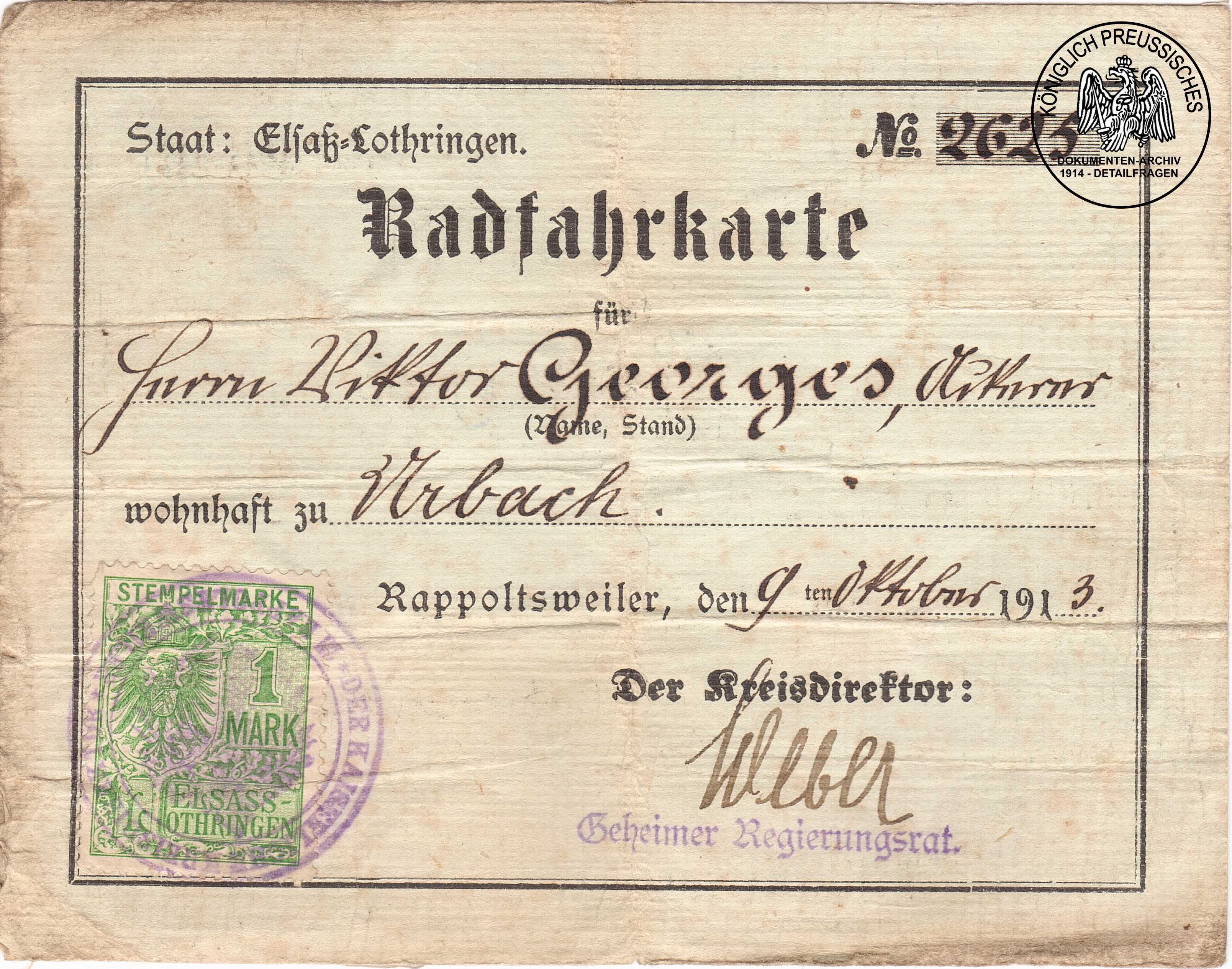 Radfahrkarte für Viktor Georges aus Urbach. |